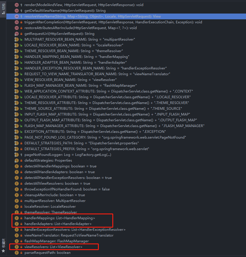 忽略方法 DispatcherServlet有一下这么多属性,大部分为static final 修饰的常量, 和上图相关的有